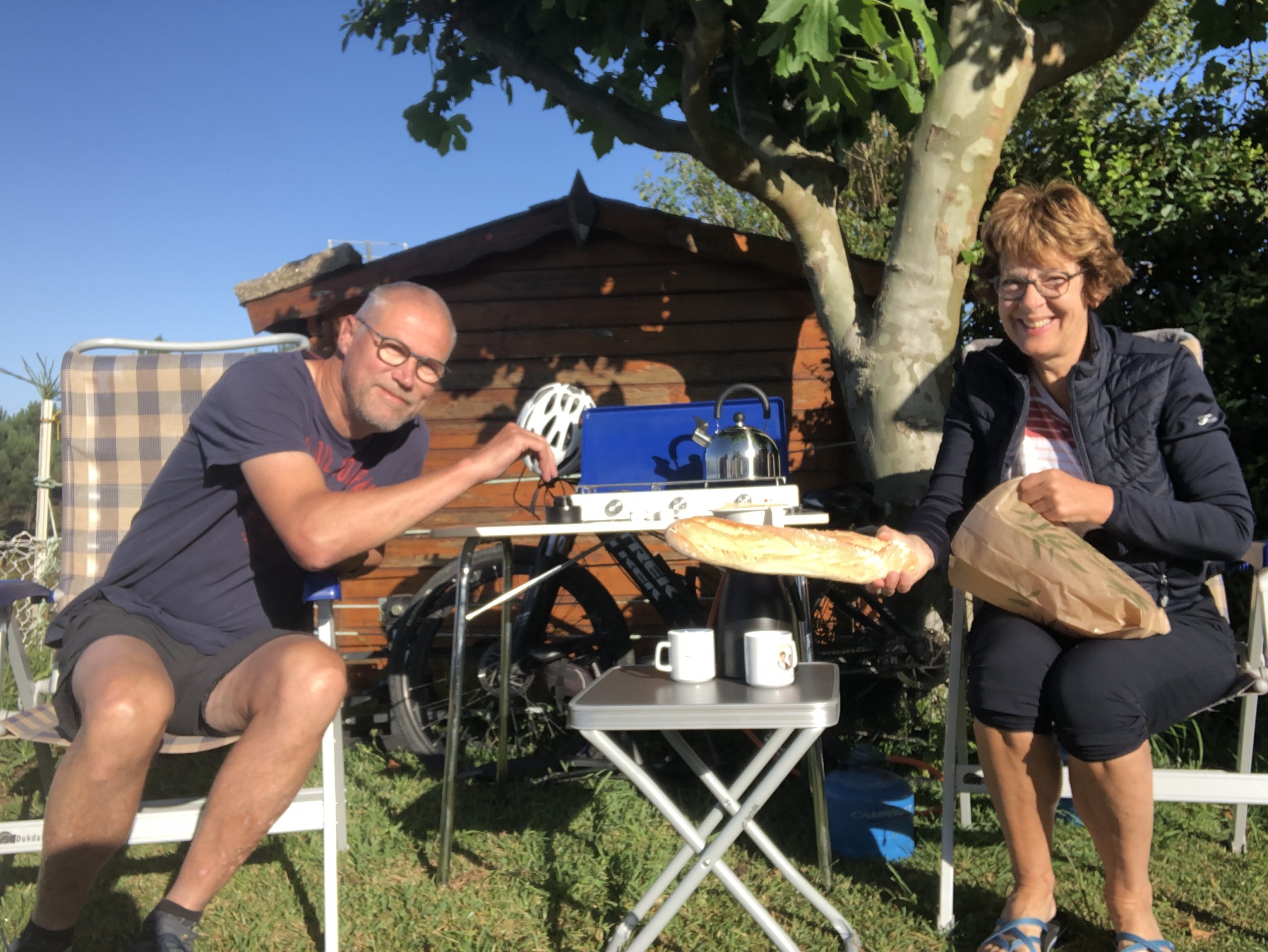 Om 9 uur was de koffie aan het pruttelen. We hadden gisteren een stokbrood en 2 croissantjes besteld dus hadden een lekker ontbijtje bij de tent. En nog veel belangrijker, een strakblauwe lucht.
