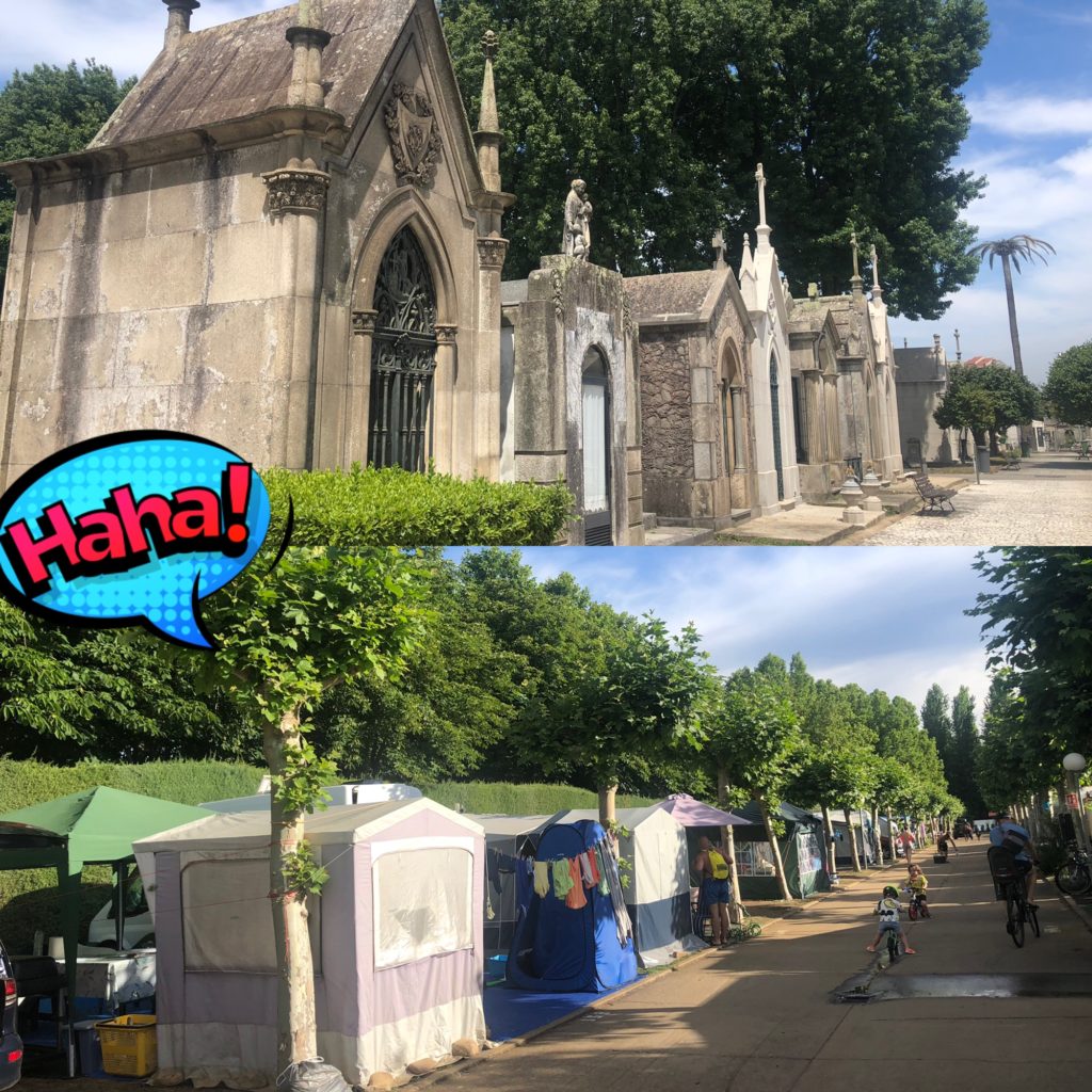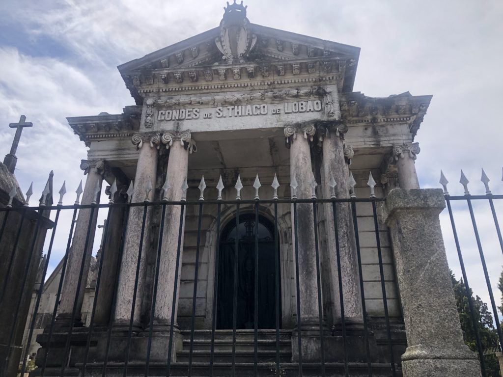 Ook nog over het Cemitério de Agramonte gelopen. Halverwege de 19e eeuw was er een cholerapandemie (soort COVID?) en hadden ze een begraafplaats nodig zo ver mogelijk van de bourgeoisie. Er moest een landgoed voor wijken. Imposante graven, groter dan de huisjes in Porto waar ze met zijn vieren in wonen.