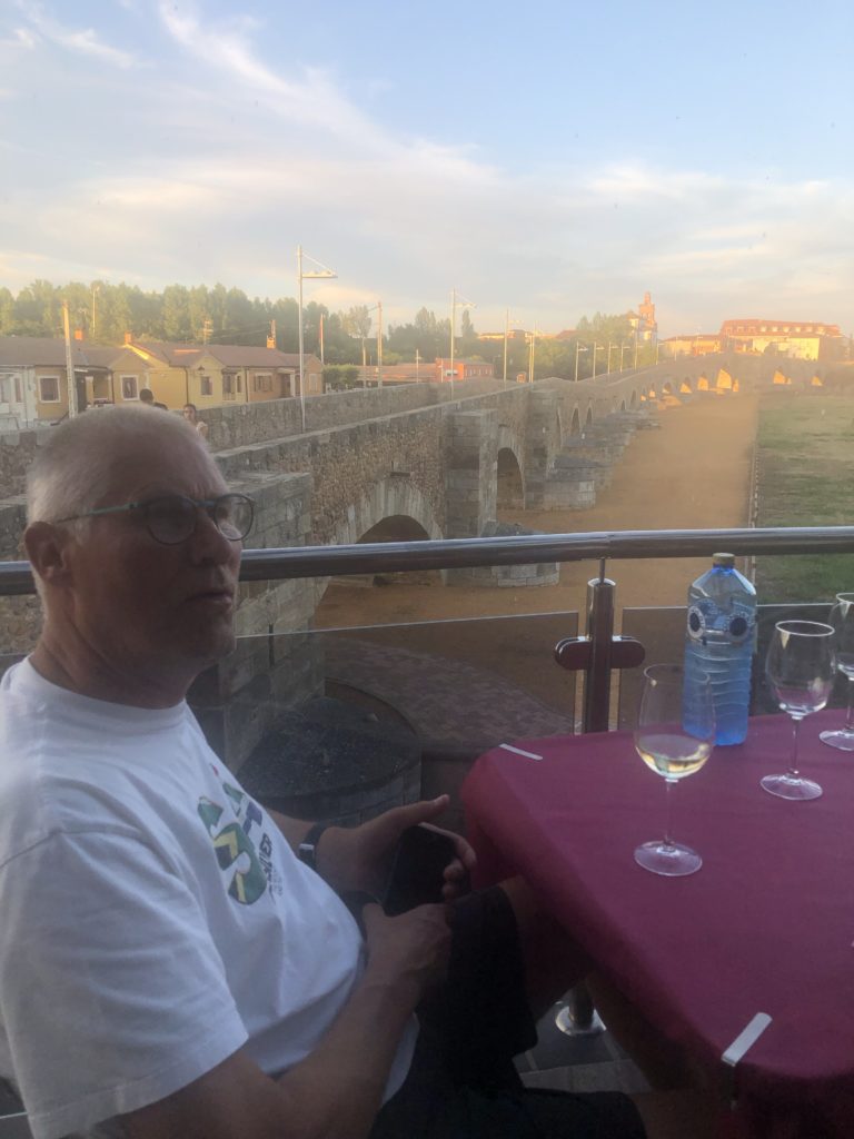 Eerst maar even het stadje in gewandeld. Een lange stenen boogbrug met 19 bogen overspant de rivier Órbigo en maakt onderdeel uit van de Camino. De brug is veel te groot voor de rivier, maar voor de bouw van een stuwmeer stroomopwaarts voerde deze rivier veel meer water af. Alles in dit stadje is ingericht op de pelgrims.